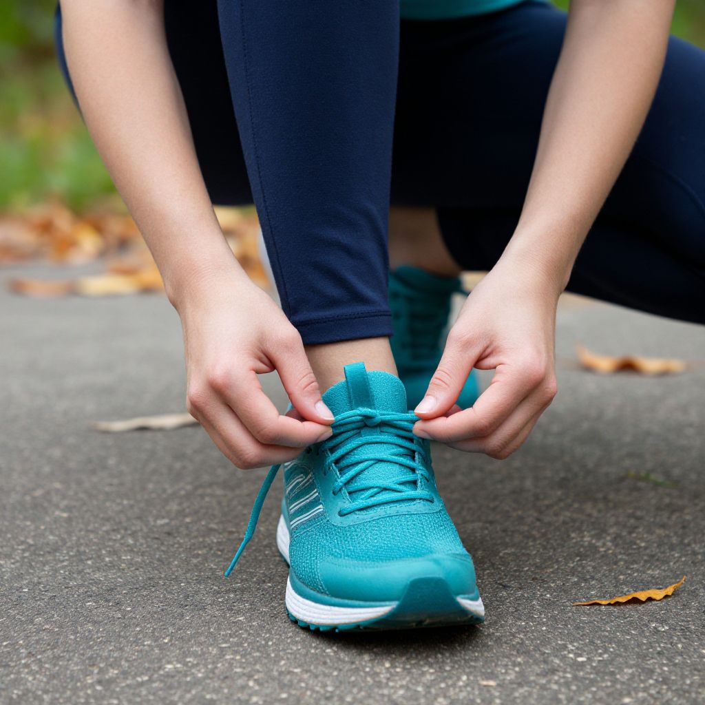Woman's hands meticulously tying teal running shoe laces while crouching on a paved path surrounded by scattered autumn leaves and blurred green foliage in the background.
