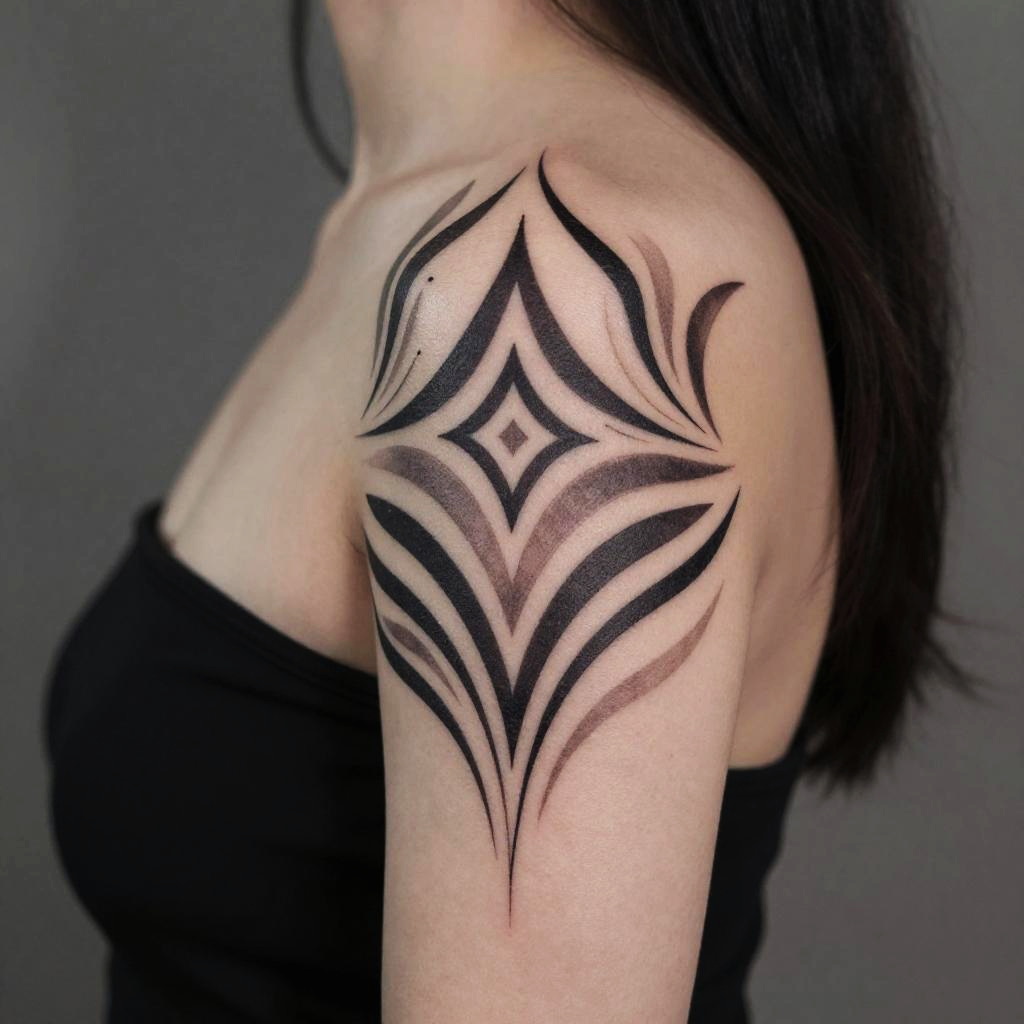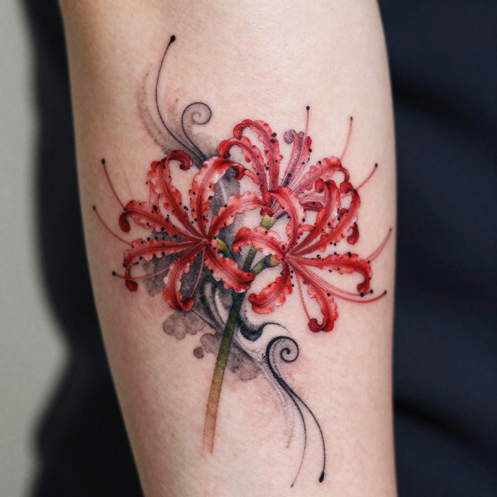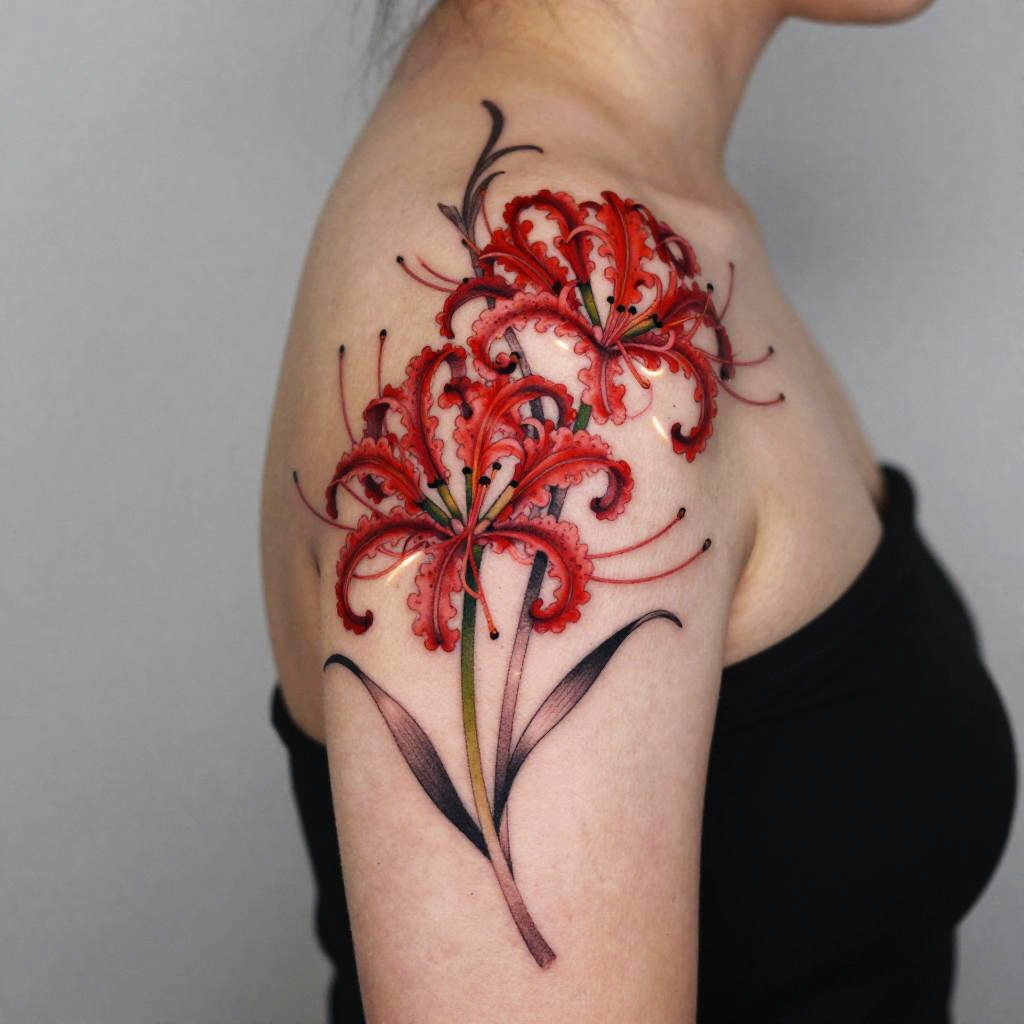 Artistic lycoris tattoo featuring stylized red spider lilies entwined in a delicate vine on a shoulder, with bold outlines, vibrant color contrasts, and intricate shading, enhanced by soft glowing effects and a minimalist background to emphasize the floral elements.