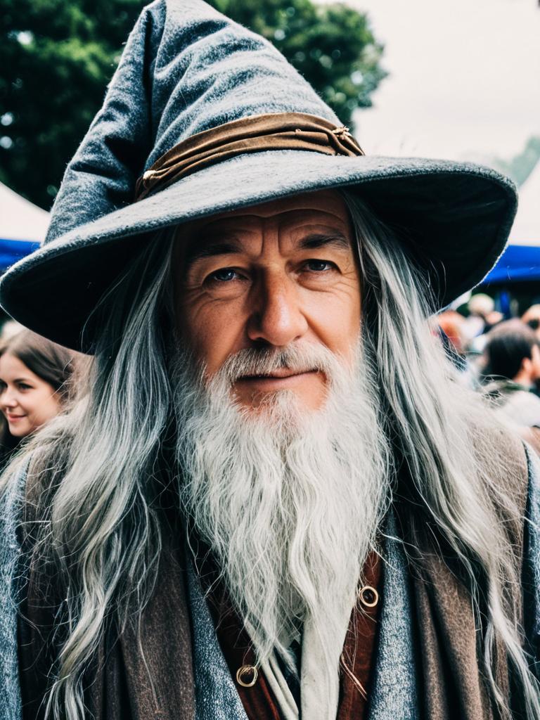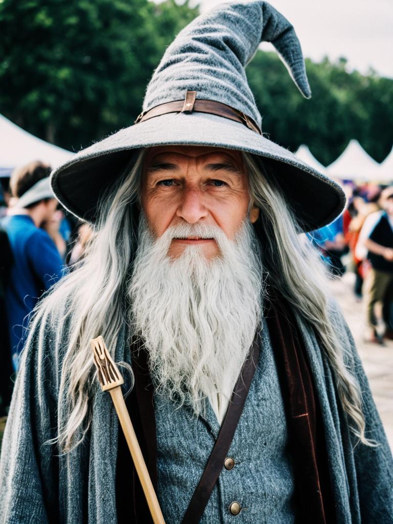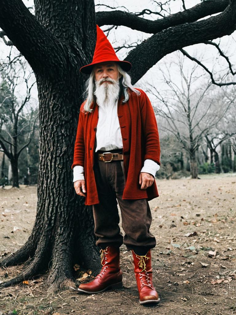 Full body portrait of an elderly man with long white hair and a long white beard wearing a tall, pointed red wizard hat and a matching red jacket. He is dressed in brown pants, a white shirt, and red lace-up boots. The man stands outdoors near a large tree on a dry, leaf-strewn ground, looking directly at the camera.