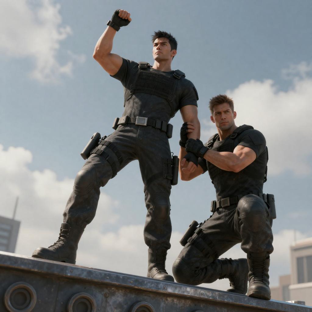 Digital artwork of two male characters in dark, tactical gear. One stands confidently on a metallic ledge, arm raised, while the other kneels, holding the first's arm. Background shows a bright sky with clouds. The characters have muscular builds and intense expressions. The ledge has industrial ures and circular patterns.