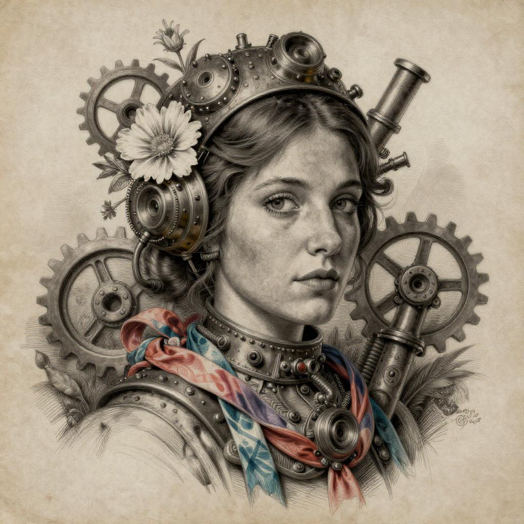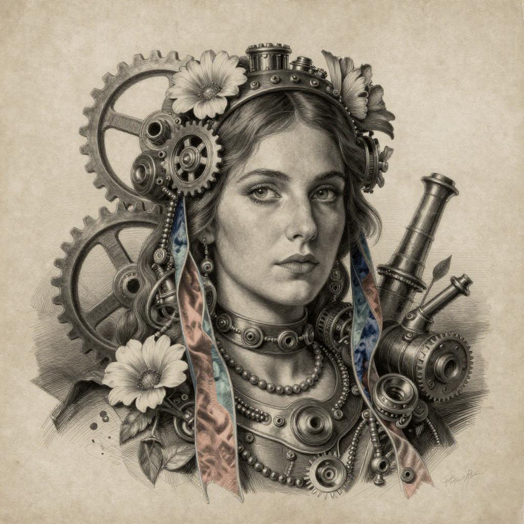 Samdoesarts Charlie Bowater realistic Lithography sketch portrait of a woman, flowers, [gears], pipes, dieselpunk, multi-colored ribbons, old paper texture, highly detailed