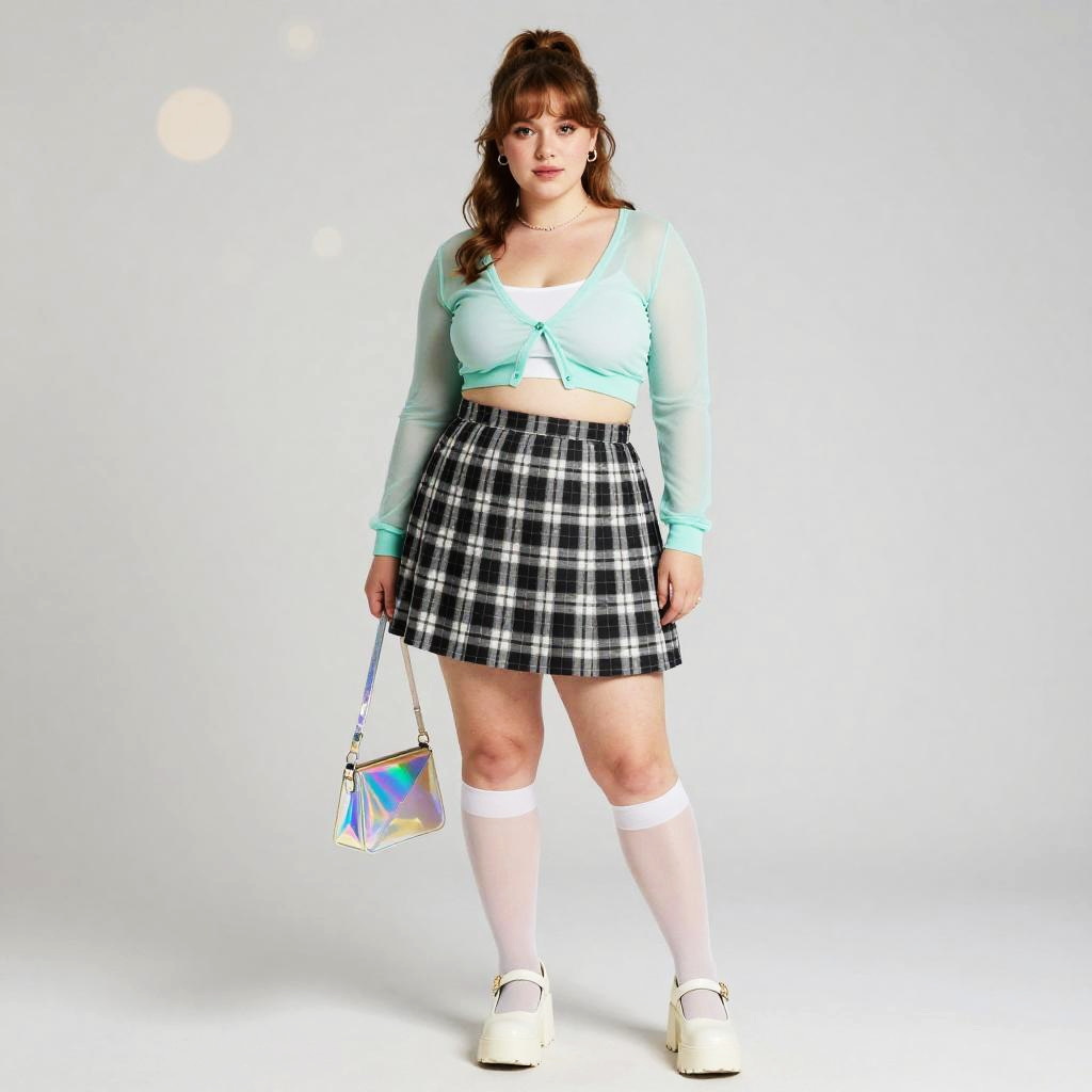 Content creator (mid-20s), Curvy, Half-up Half-down with Face-Framing Layers, douyin outfit, mint mesh cropped cardigan layered over a white bralette, black-and-white checkerboard pleated mini skirt, sheer knee-high socks, white chunky platform Mary Janes, clear holographic crossbody bag, dreamy bokeh portrait