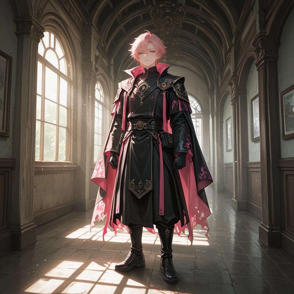 Photograph, Canon DSLR, movie still, rough digital painting, (full body:1.2), 1boy, man, handsome, solo, [:fantastical costume design, :0.2] warlord, chinese, pink hair, (solid:1) build, natural sunlight, interior