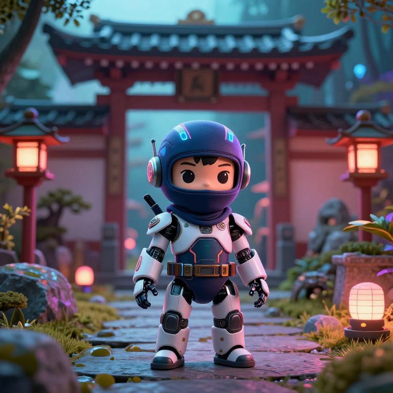 A futuristic ninja robot toddler stands in a mysterious ancient Japanese garden, adorned with neon accents and a cinematic atmosphere, set against a backdrop of a traditional gate and beautifully color graded lighting.