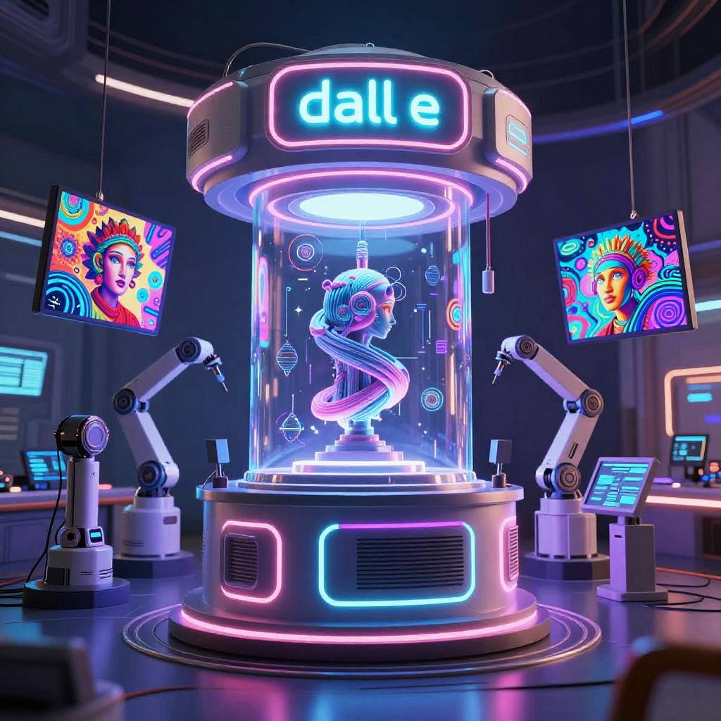 Dall e generator depicted as a futuristic AI hub glowing with neon lights, surrounded by floating digital art canvases and robotic arms creating surreal artwork in a high-tech studio environment, cyberpunk style, ultra detailed