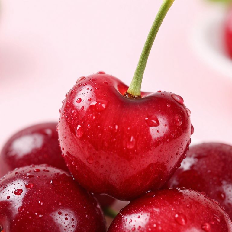 Fresh cherries bursting with juice, close-up shot showing details of water droplets on their skin, vibrant red tones against a soft pastel background, bright and clean aesthetic capturing the freshness and sweetness of the fruit.