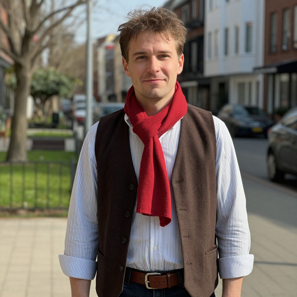 A man with a friendly, casual demeanor stands in a sunlit urban setting, wearing a brown vest with a red scarf wrapped around his neck, a neatly folded striped shirt underneath, and a brown leather belt securing his waist. He has short, slightly messy hair, a warm smile, and a calm expression, adding to the relaxed, authentic atmosphere of the scene. The background features a mix of city architecture and greenery, suggesting a peaceful neighborhood or parkside street.