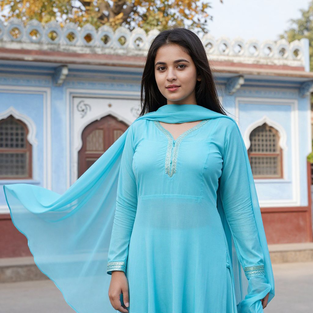 A young woman with smooth fair skin and a kind face, wearing a bright light blue salwar kameez as a costume, standing in front of a vintage haveli with blue and white painted walls, under a clear autumn sky, the wind gently blowing her flowing sari-like top, natural outdoor lighting, hyper-realistic portrait style. The woman has big tits and cute face