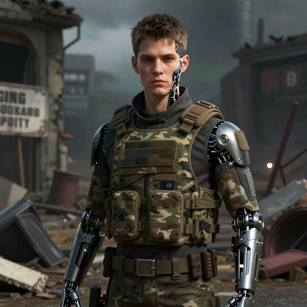Exposure Bracketing sci-fi grimdark setting, lithe young male rebel with half mechanical cheek with glowing veins and biomechanical left arm with flexible joints, wearing a patched urban camo ballistic vest, standing with a stoic expression with ruins and signs of warfare behind him