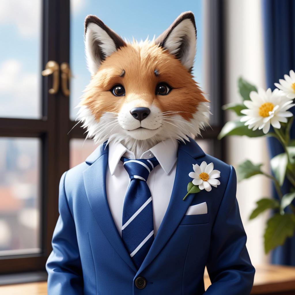 Necktie, flower, suit, formal, shirt, furry, blue suit, white shirt, white flower, indoors, no humans, collared shirt, window, male focus, 1boy, solo, furry male, black necktie, blurry, upper body, jacket, animal focus, animal, blurry background, clothed animal