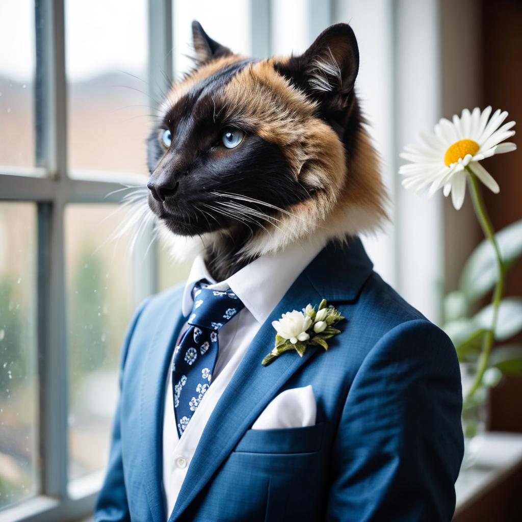 Portrait of a furry black and brown cat with blue eyes dressed in a blue suit, white collared shirt, and patterned necktie. The cat has a white floral boutonniere pinned to the suit jacket and stands indoors near a window. A white daisy flower is visible in the background, creating a soft, formal atmosphere.