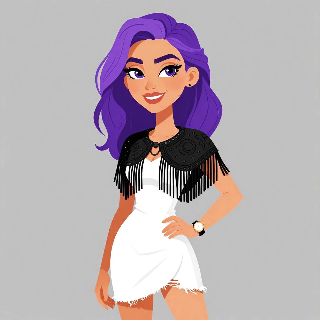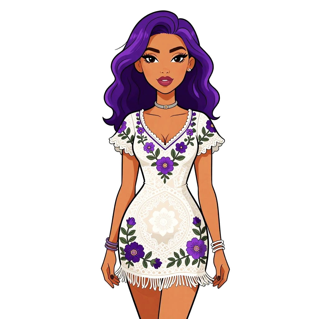 This is a digital illustration of a young woman with long, wavy, dark purple hair and fair skin. She has large, expressive brown eyes with long lashes and is smiling slightly. She is wearing a sleeveless, yellow, V-neck dress adorned with colorful, floral embroidery along the neckline. The dress is slightly sheer at the hem, revealing a hint of her thighs. She accessorizes with a simple necklace and small earrings. The background is a plain white rectangle with a textured brown border on either side. The overall style is vibrant and cartoon-like, with smooth, clean lines and bright colors.