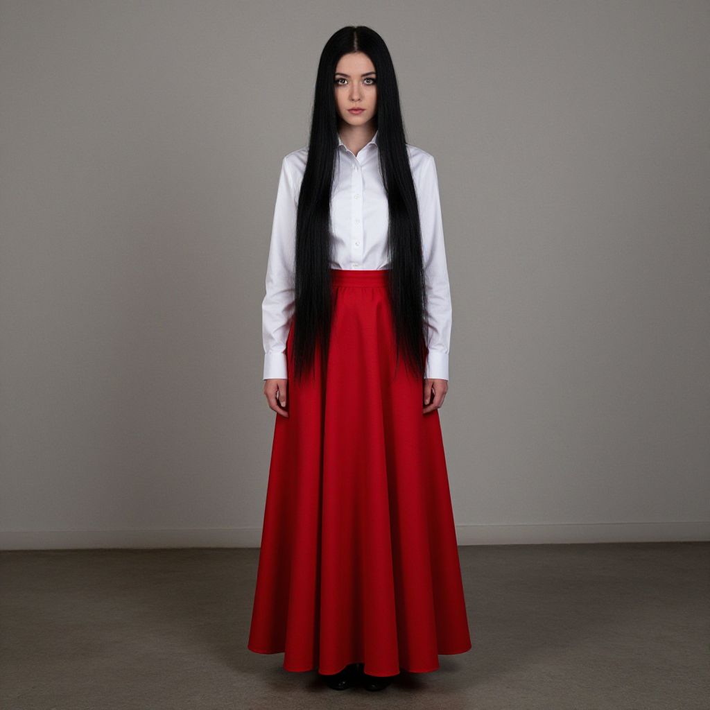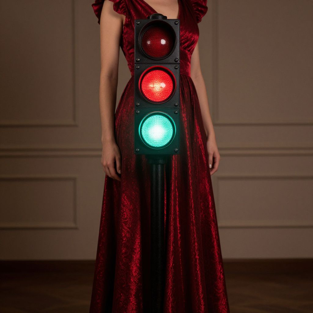 Red Light Green Light Fancy Dress, a close up of a woman in a long dress standing in a room