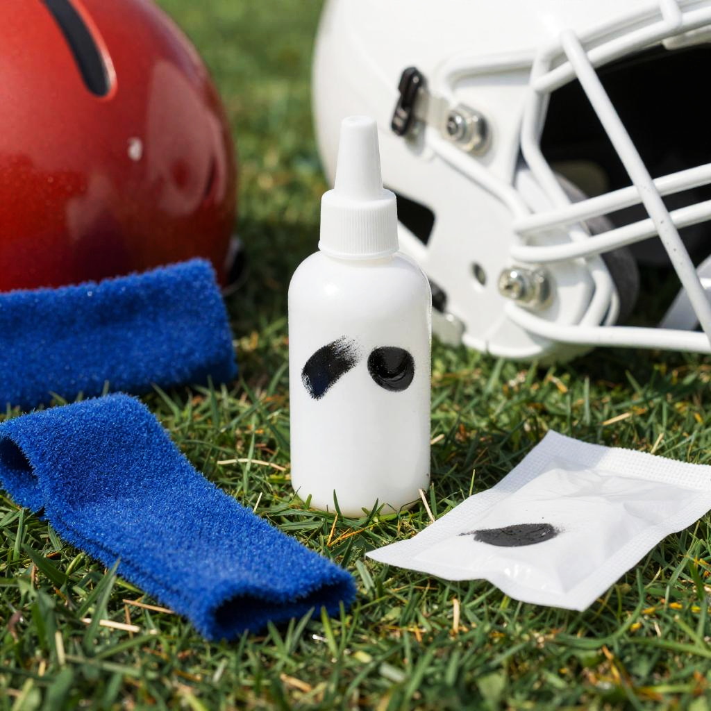 Eye black remover bottle and wipes on a sports field, surrounded by football gear and sweatbands, vibrant lighting, realistic texture, close-up of removing black grease paint from athlete's cheek, dynamic action shot