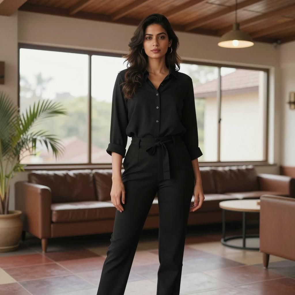 Long evening party dress, photograph of an attractive South Asian woman, standing in elegant room, wearing a black, sleeveless, V-neck evening gown, medium bust, dark hair in an updo, light brown skin, serious expression, background with gold-framed mirror, red holiday wreaths, green plants, chandelier with candles, black draped tables with white napkins, warm lighting, luxurious and festive atmosphere, full body shot, front view, slight smile