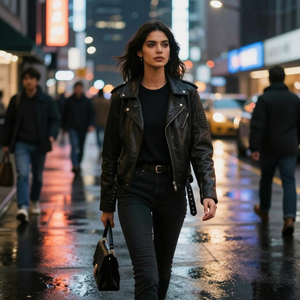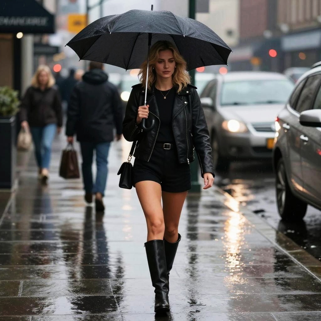 Photograph of a blonde woman with wavy hair, wearing a black leather jacket, black shorts, and knee-high boots, walking on a rainy city street. She holds a black umbrella above her head, and her expression is focused. The wet pavement reflects city lights and parked cars, with blurred pedestrians in the background. The overall mood is urban and rainy.