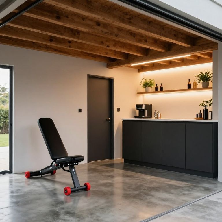 Garage conversion showcases a sleek, multifunctional space featuring a polished concrete floor, exposed wooden beams overhead, and a wall-mounted workout bench with red wheels positioned near the entrance, alongside a cozy bar area with dark cabinets, a countertop equipped with a coffee maker and decorative items, and shelves adorned with plants and bottles, all illuminated by warm, linear lighting above.