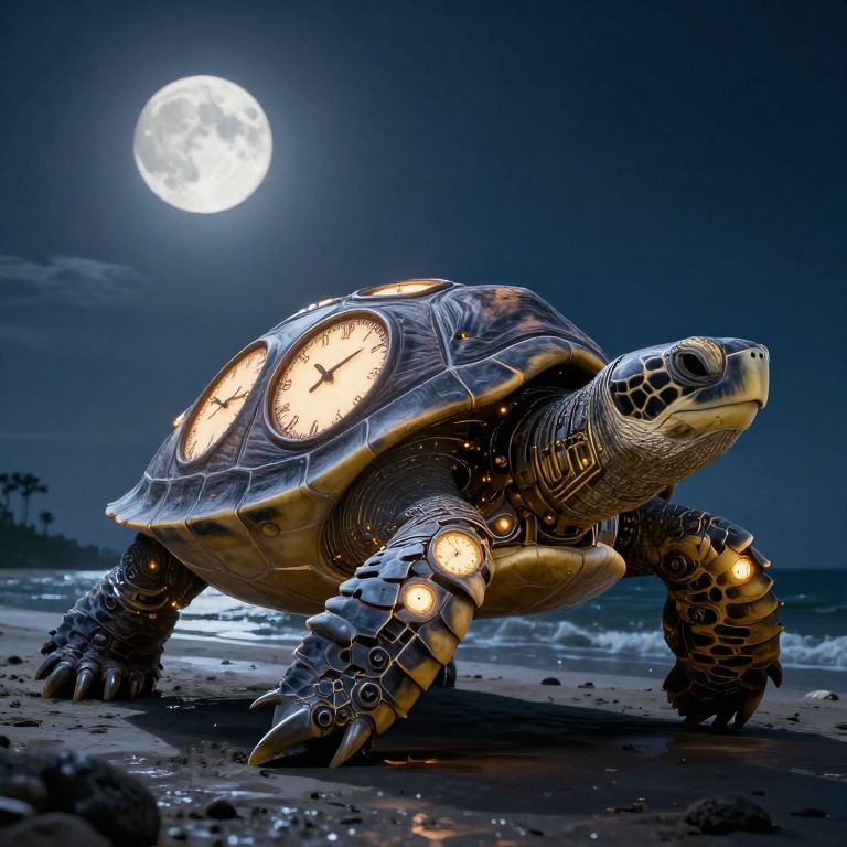 A colossal turtle adorned with glowing clock faces lumbers across a moonlit shore, its mechanical body merging the natural world with the timeless passage of time.