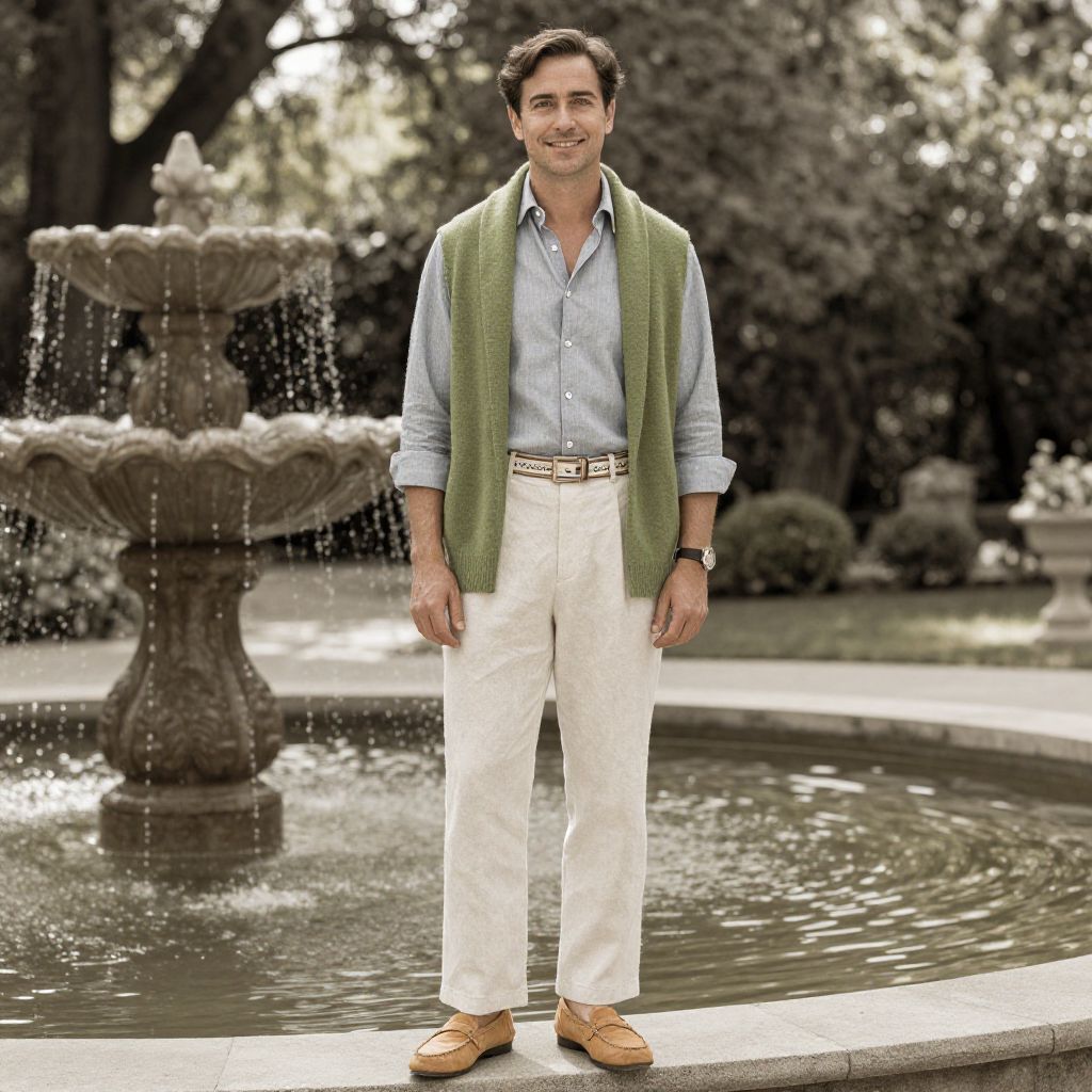 A man, breezy chambray button-up, off-white linen trousers, tan suede loafers, soft olive green shawl, nautical-themed belt, serene garden, soft sunlight filtering through trees, tranquil water fountain, sepia effect, relaxed smile. Man has masculine face and piercing eyes