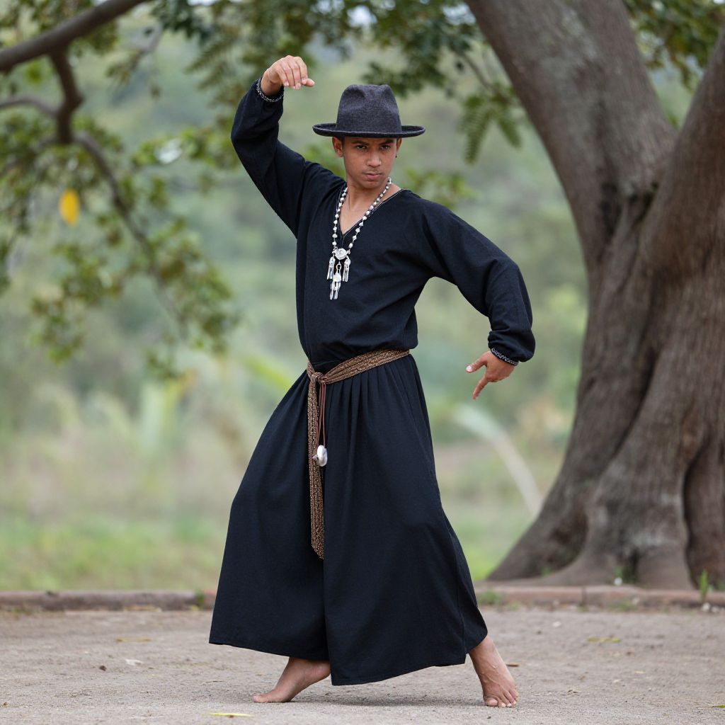 Gypsy dance costume, 1boy, solo, male focus, outdoors, hat, full body, standing, tree, looking at viewer, blurry background, necklace, jewelry, closed mouth, blurry, long sleeves, day, plant