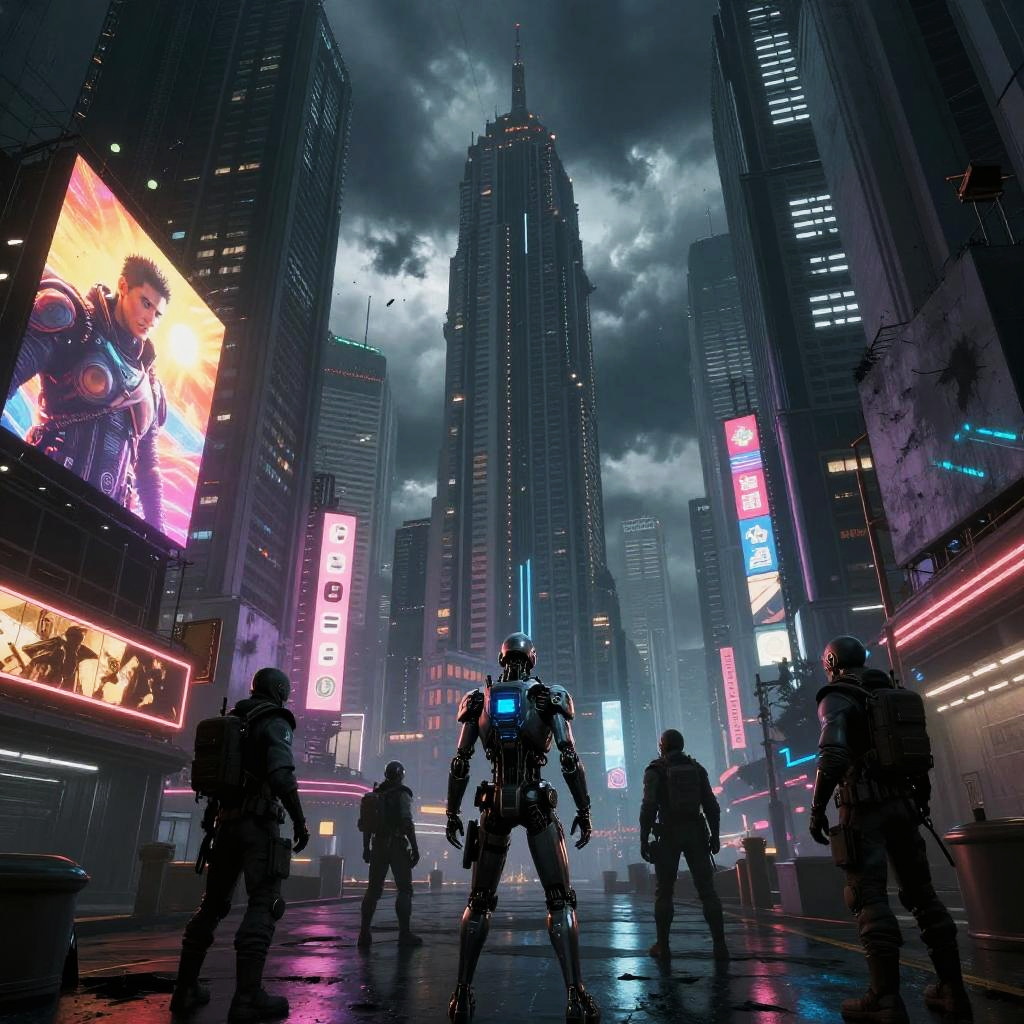 Cyberpunk moonlit cityscape with glowing mushrooms, futuristic towers, two silhouetted figures, spacecraft, and a large, bright full moon