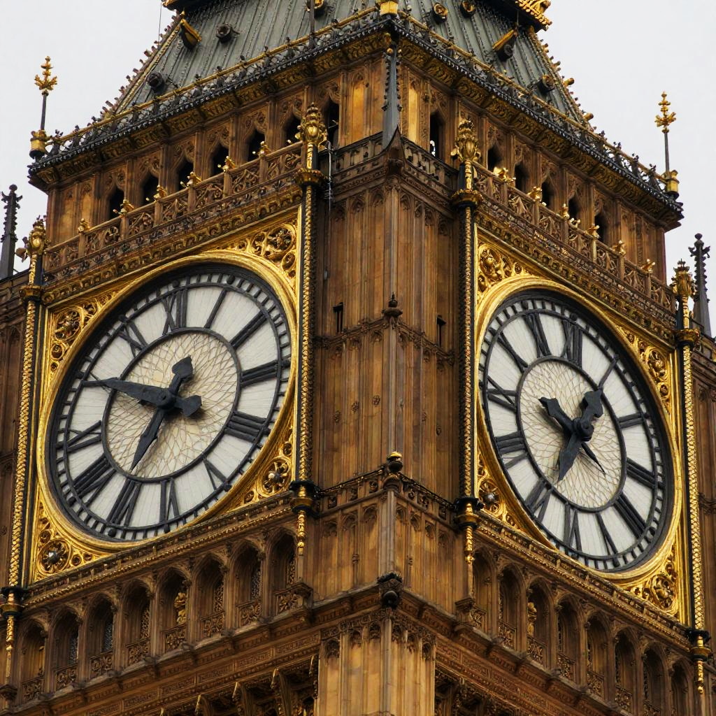 This is a close-up photograph of a grand clock tower, focusing on two large, ornate clocks side by side. The clocks have white faces with black Roman numerals and black clock hands, set against a rich, golden-brown, stone facade with intricate carvings and decorative patterns. The lighting highlights the detailed craftsmanship, giving the image a warm, golden glow.