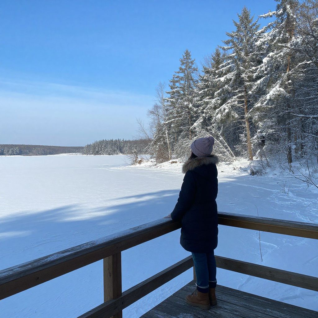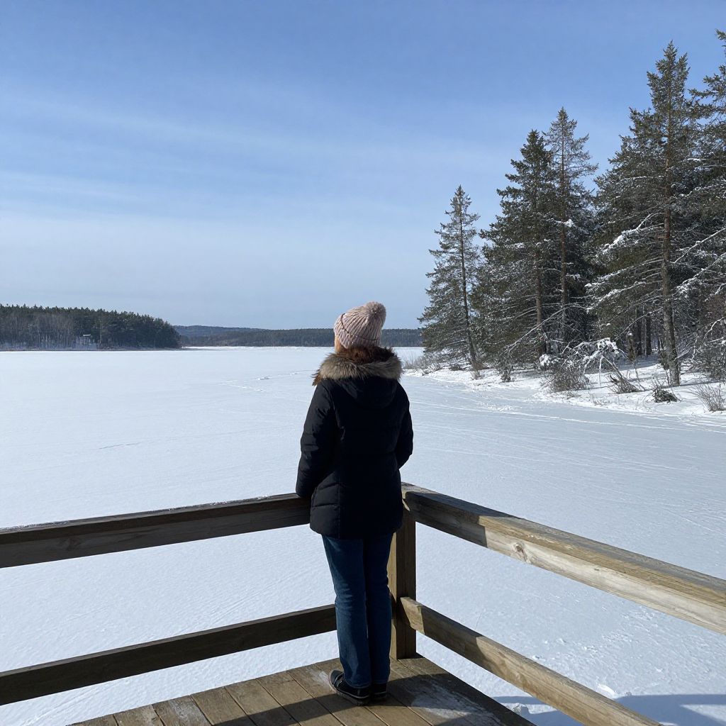 Winter's serene landscape unfolds as a woman stands on a wooden deck, leaning against a railing, gazing out over a vast frozen lake bordered by snow-covered evergreens under a clear blue sky.