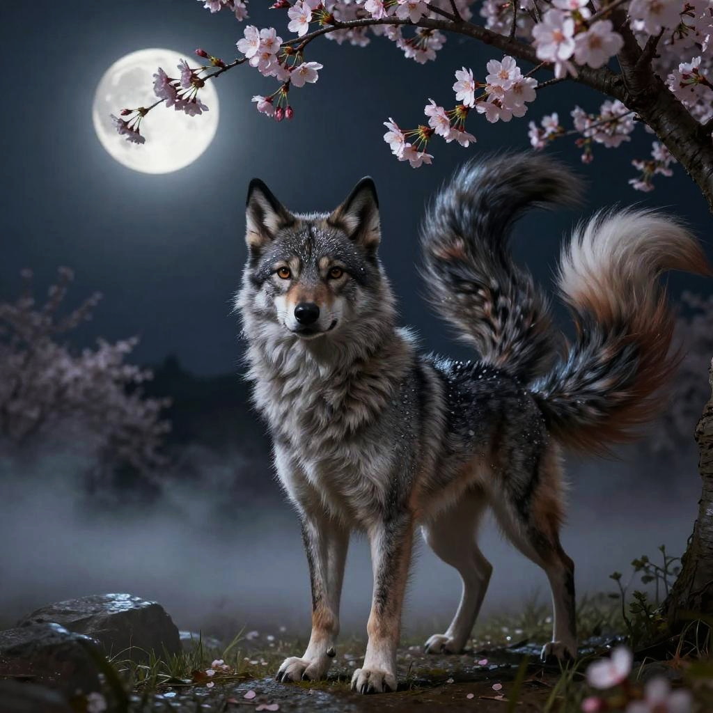((solo)) (feral, ninetales), female, looking at viewer, cherry blossom, night, fog, flower, multi tail, full moon, [best quality, shaded, extreme detail, highly detailed, ultradetailed, intricate, realistic], detailed background, by Enki Bilal, by wolfy-nail, by Michael & Inessa Garmash, Ruan Jia, by drmax