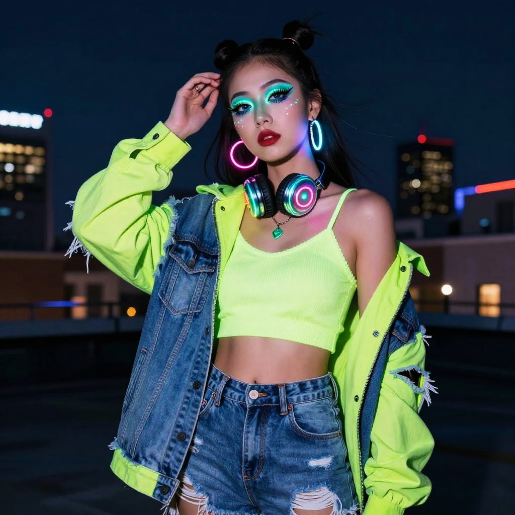 Neon punk fashion ensemble featuring glowing neon makeup, oversized accessories, ripped neon-dyed clothes, urban rooftop setting at night, electric energy and unconventional style