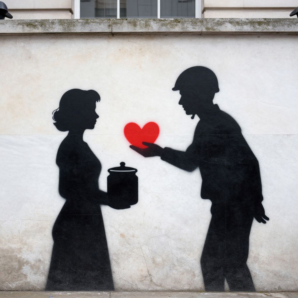 A striking stencil graffiti artwork attributed to Banksy, featuring two silhouetted figures—a woman holding a pot and a man in a helmet—engaged in a symbolic exchange of a red heart, rendered in bold black and white with a minimalist aesthetic on a weathered wall at Marble Arch, London, UK.