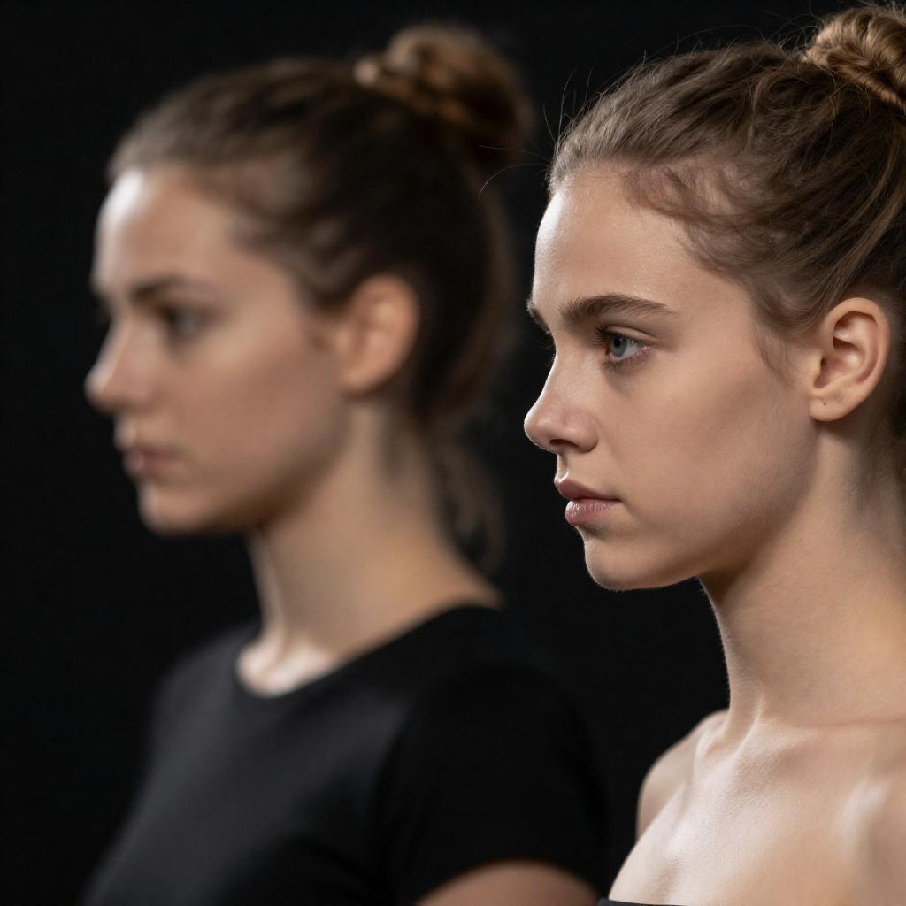 Photograph of four young women with long blonde hair, standing in profile. All wear white shirts. Hair gently blows. Background is dark. Women close together, partially obscured. Light highlights hair. Soft, natural lighting. Faces not visible.