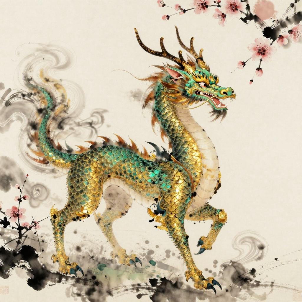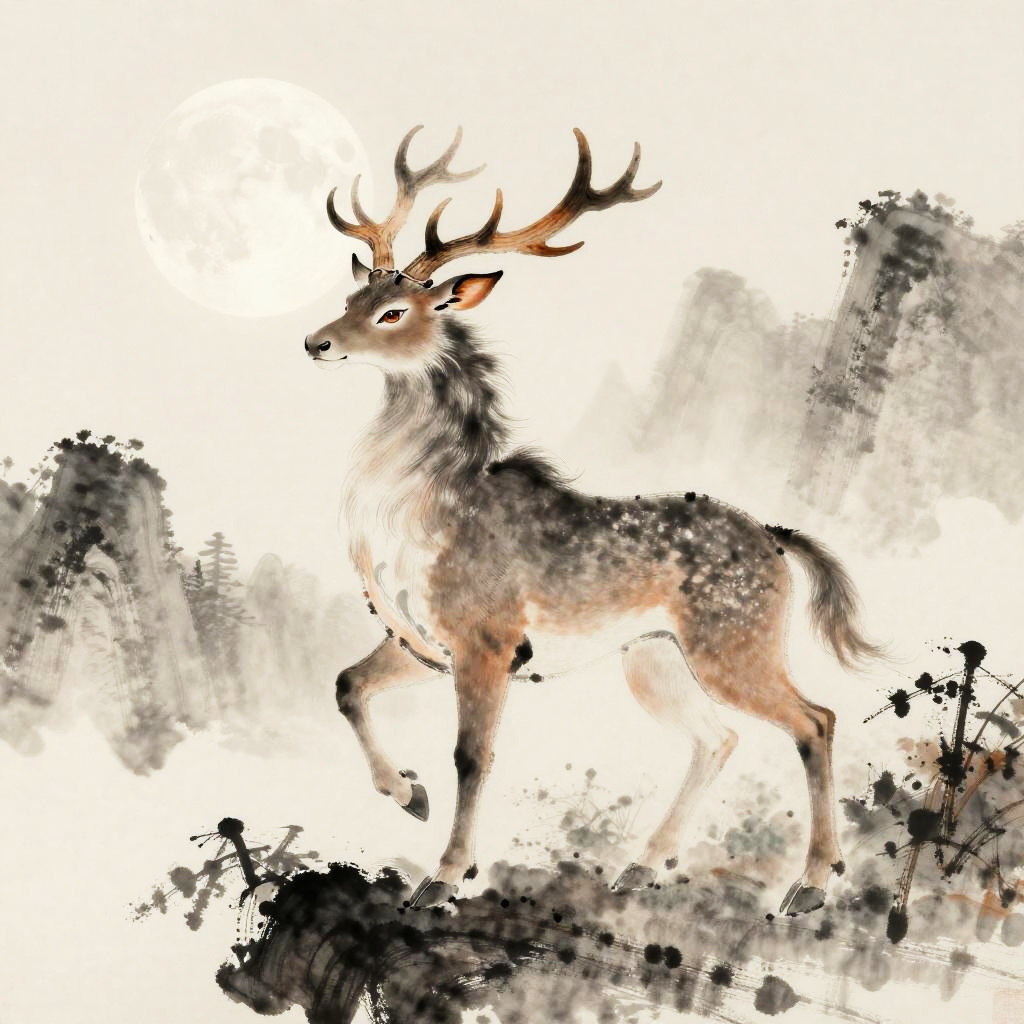 Qilin drawing depicting a serene, elegant creature with flowing mane and antlers, poised on a mountaintop under a full moon, traditional Eastern ink wash style with soft gradients, emphasizing the mythical and peaceful nature of the qilin in a fantasy landscape.