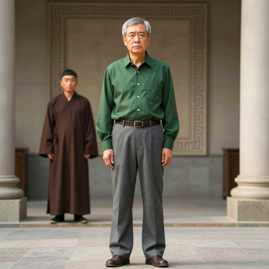Green shirt grey costume, photograph of an older Asian man standing in a grand hall, wearing green button-up shirt, gray loose pants, brown belt, brown shoes, short gray hair, serious expression, stone wall background with intricate patterned frame, soft lighting, another person in brown robe blurred in background, symmetrical pillars, realistic style, subtle shadows
