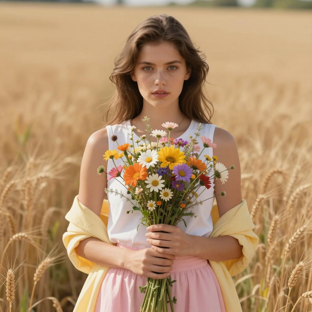 Portrait of a blonde woman with light skin, blue eyes, and pink lips wearing a ruffled pink dress standing in a field of red poppy flowers under bright daylight with a blue sky background. The woman has a neutral expression.