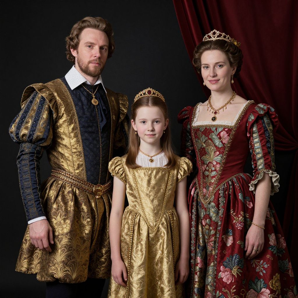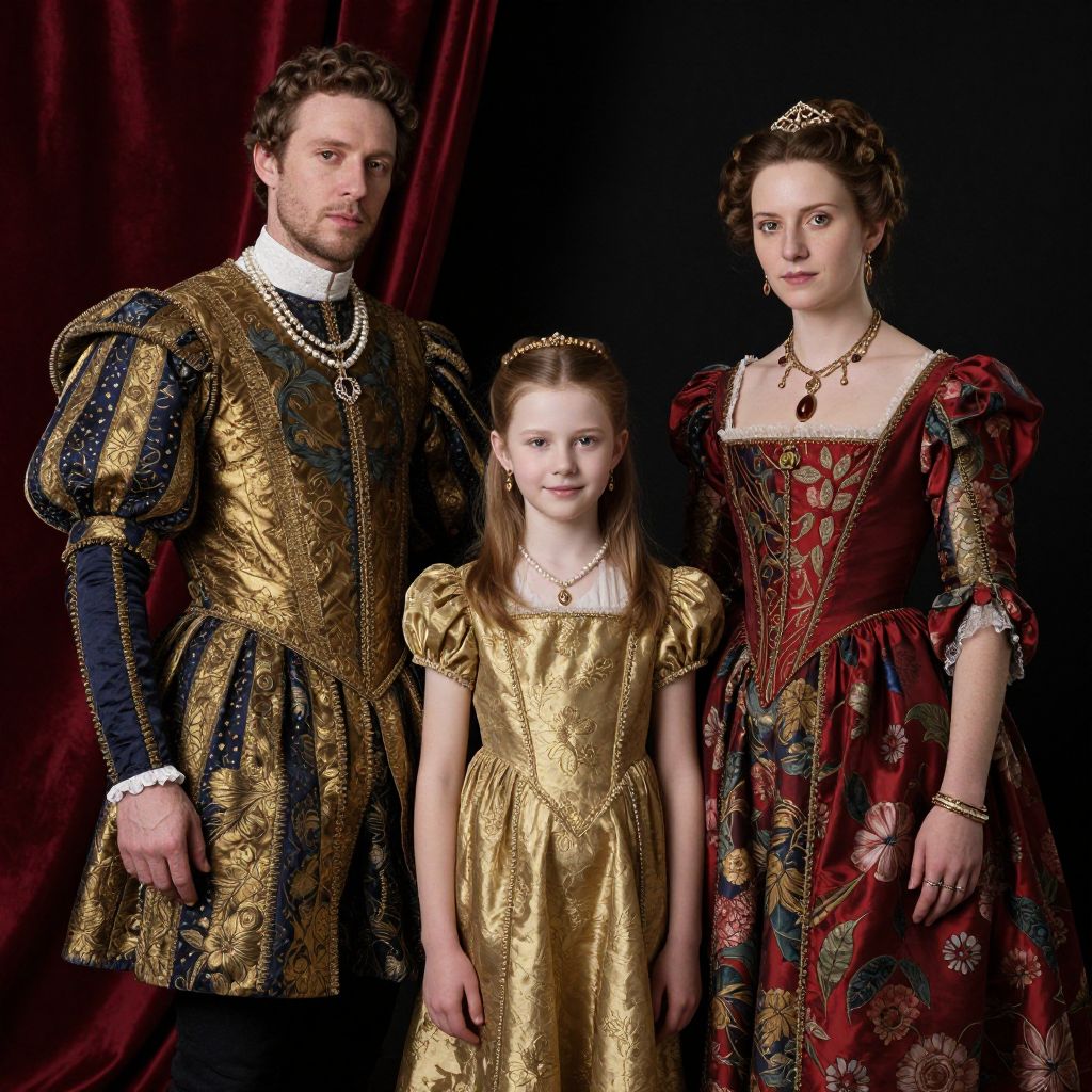 Photograph of a European royal family in period attire. A bearded man with curly brown hair in a gold and navy blue, heavily embroidered doublet with puffed sleeves stands on the left. A fair-skinned woman with dark, curly hair adorned with a tiara wears a red, gold-embroidered gown with puffed sleeves on the right. In the center, a young fair-skinned girl with straight brown hair in a gold, satin dress with puffed sleeves. They stand against a dark red velvet curtain, exuding regal elegance. The man wears a white ruffled shirt and pearl necklace; the woman wears a black necklace.
