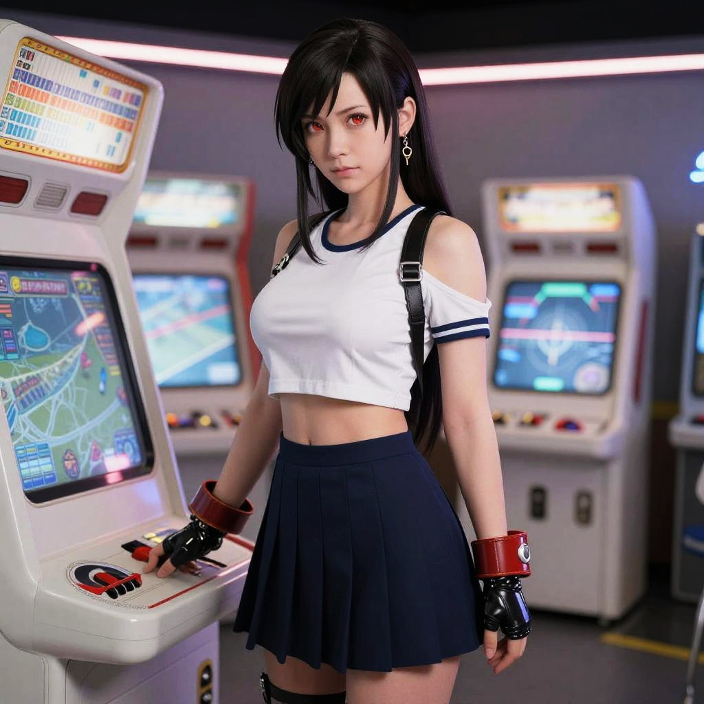 (8k, best quality, masterpiece:1.2), (realistic, photo-realistic:1.37), ultra-detailed, 1 girl, tifa_lockhart, ((red_eye_iris:1.2)), beautiful detailed girl, full body, realistic, (medium_breasts:1), (sailor collar school uniform:1), (pleated skirt:1), from side, light on face, cinematic lighting, detailed_arcade_center, arcade machine:1