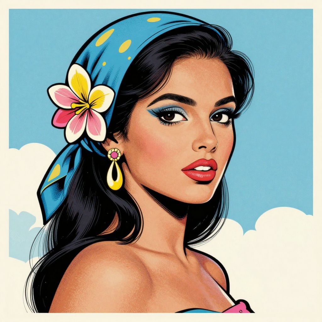 A vibrant pop art poster of a confident Latina woman with a blue headscarf and floral accessory, set against a light blue sky, reminiscent of Alphonse Mucha's style.
