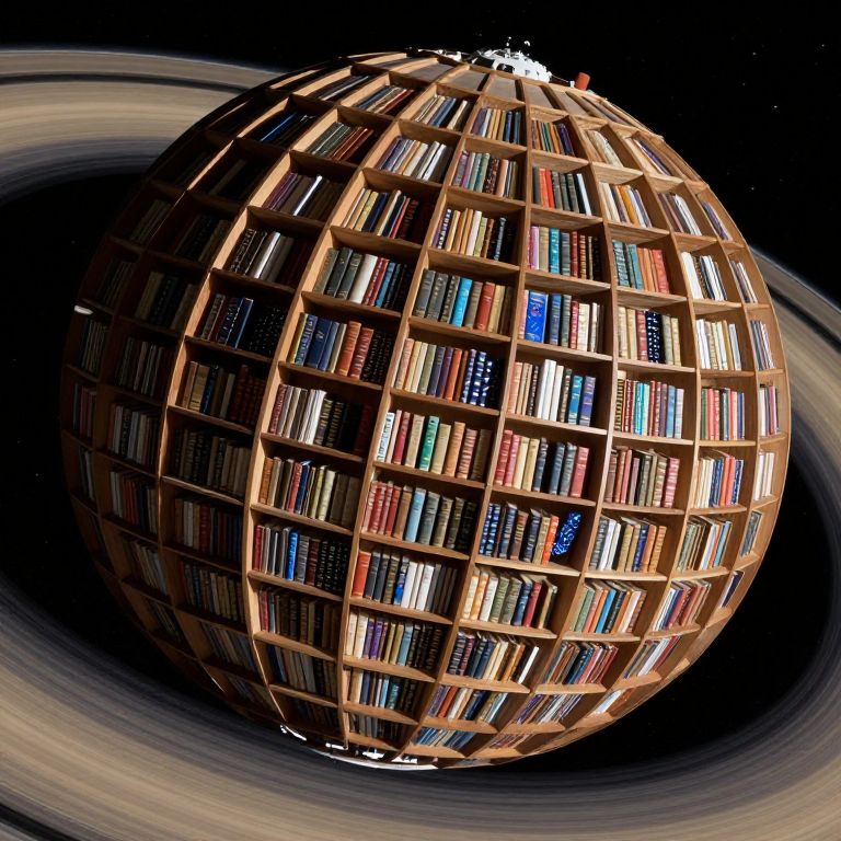 Orbiting Saturn, a spherical library constructed from concentric rings of wooden bookshelves cradles countless books, their pages shimmering with fractal constellations visible only under the serene glow of starlight.