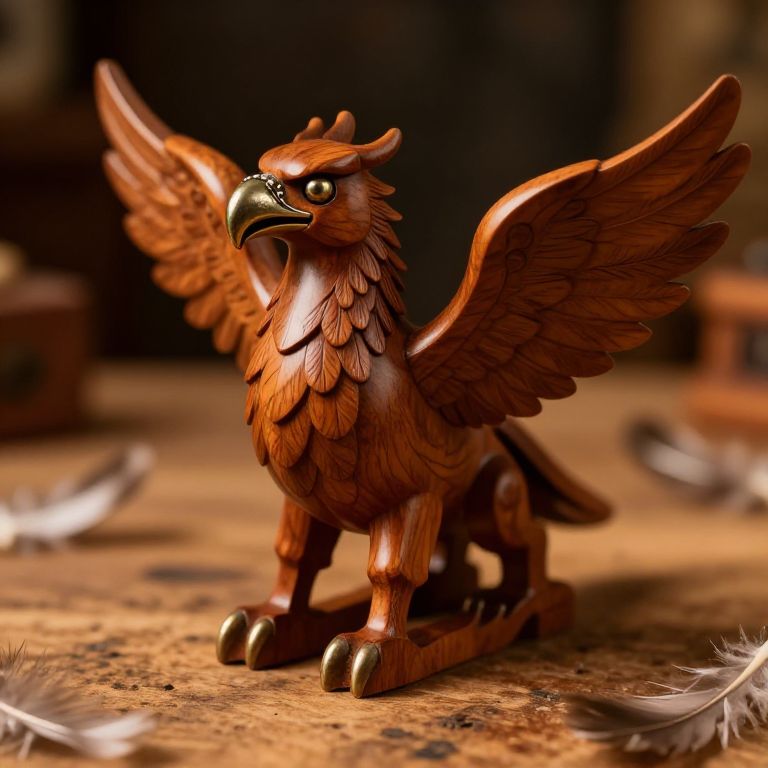 Artistic close-up of a finely crafted wooden gryphon toy, polished surfaces with carved feathers and metal embellishments on beak and claws, placed on a rustic table with scattered feathers, warm ambient lighting highlighting textures and craftsmanship.