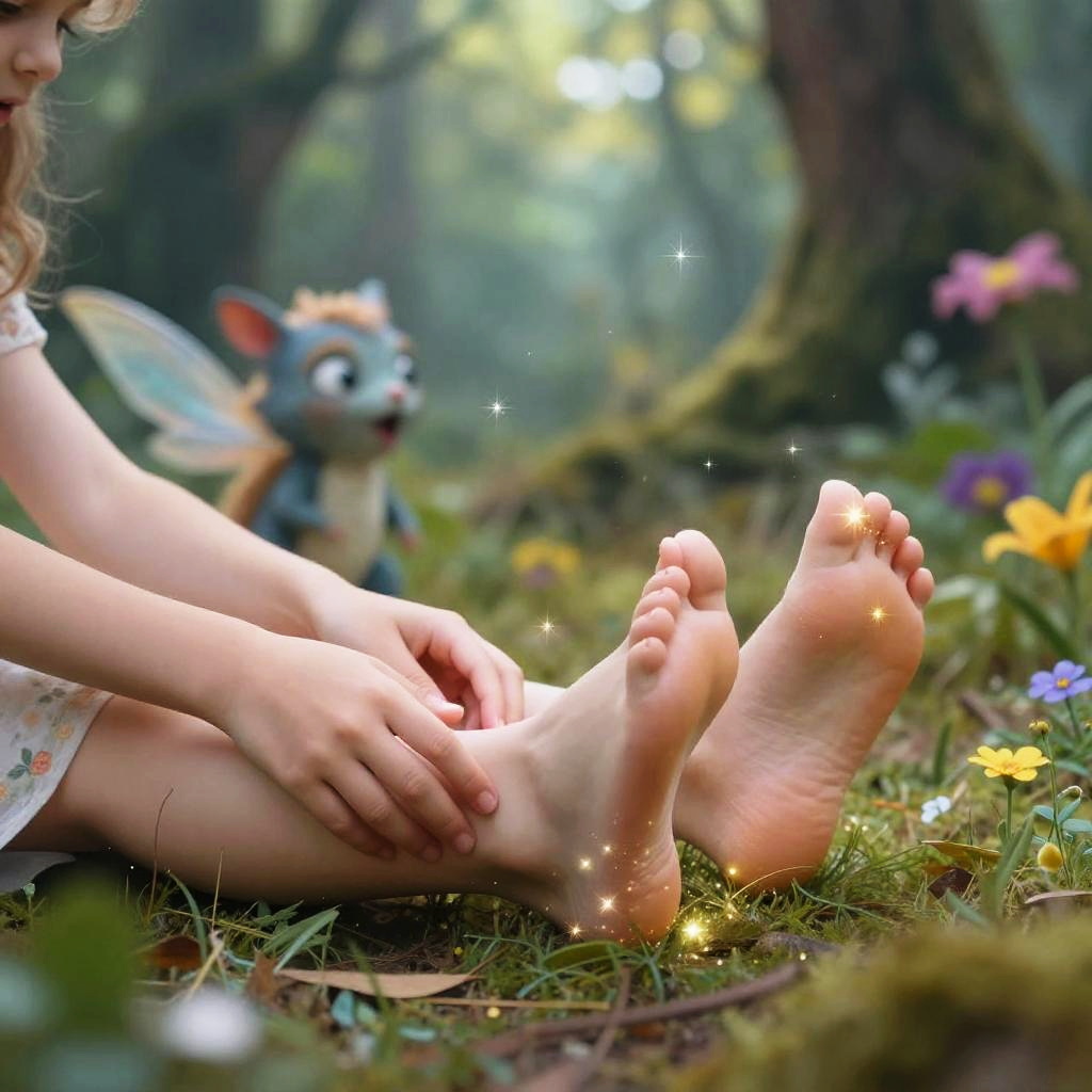 Girls feet tickled, fantasy-themed scene with ethereal glowing feet and gentle fairy hands tickling, dreamy forest background with soft magical light, surreal atmosphere, delicate sparkles and vibrant flora, imaginative creature expressions showing joy and surprise.