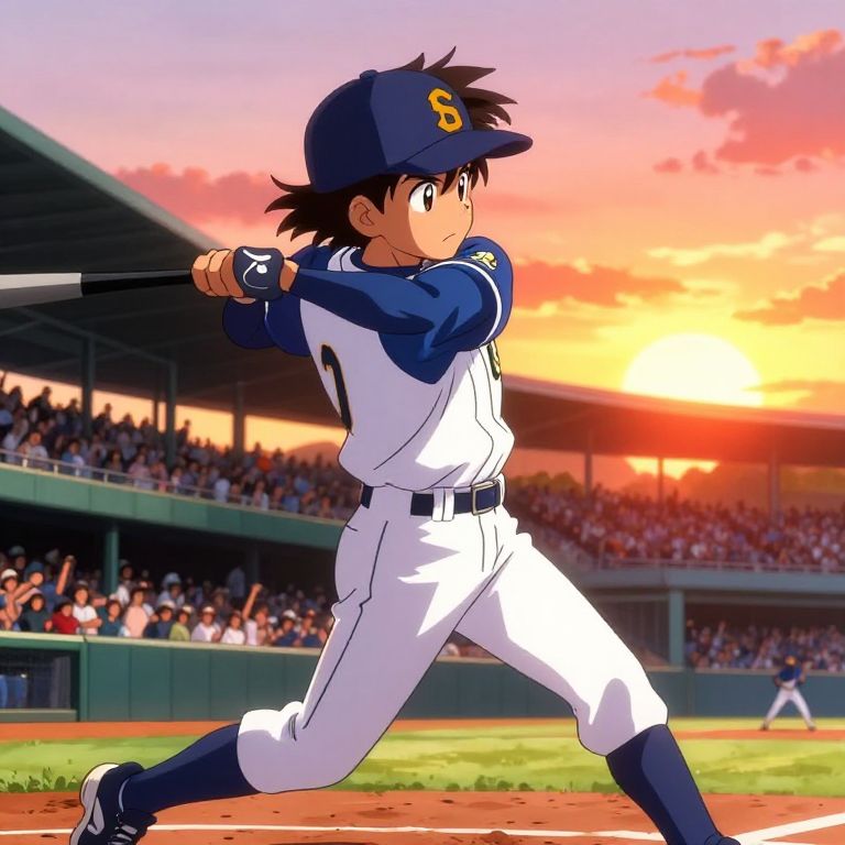 Anime-style drawing of a young baseball player in a white and blue uniform, mid-swing at sunset, with a crowd in the stadium background.