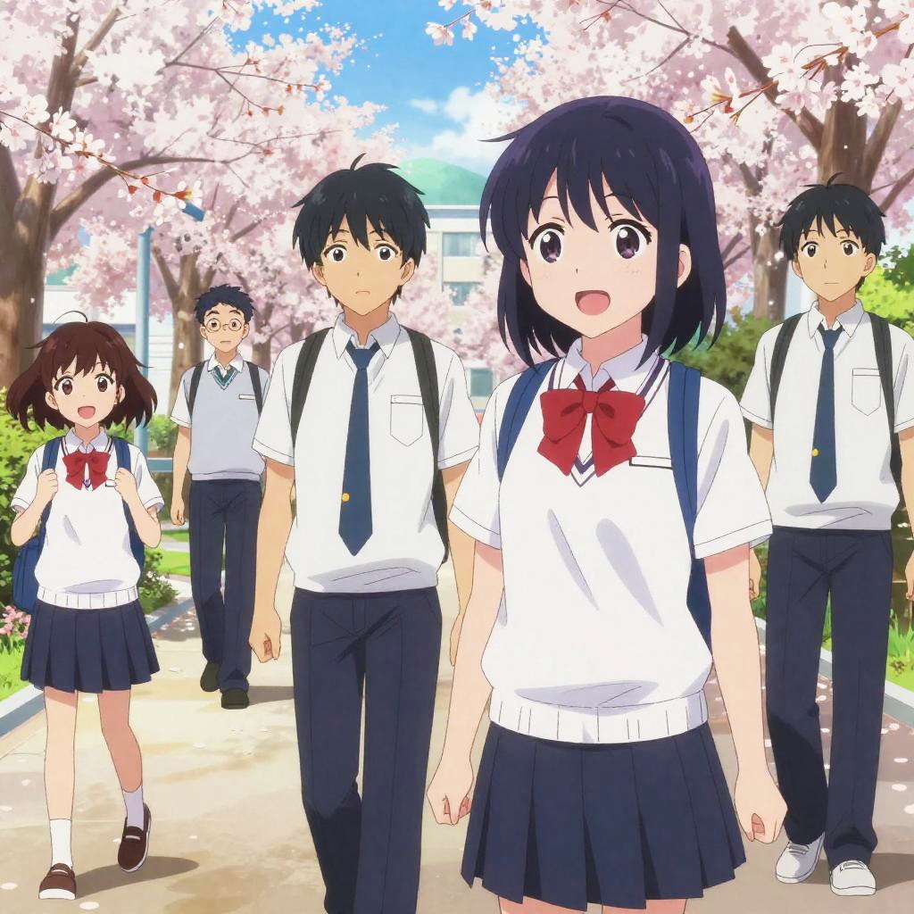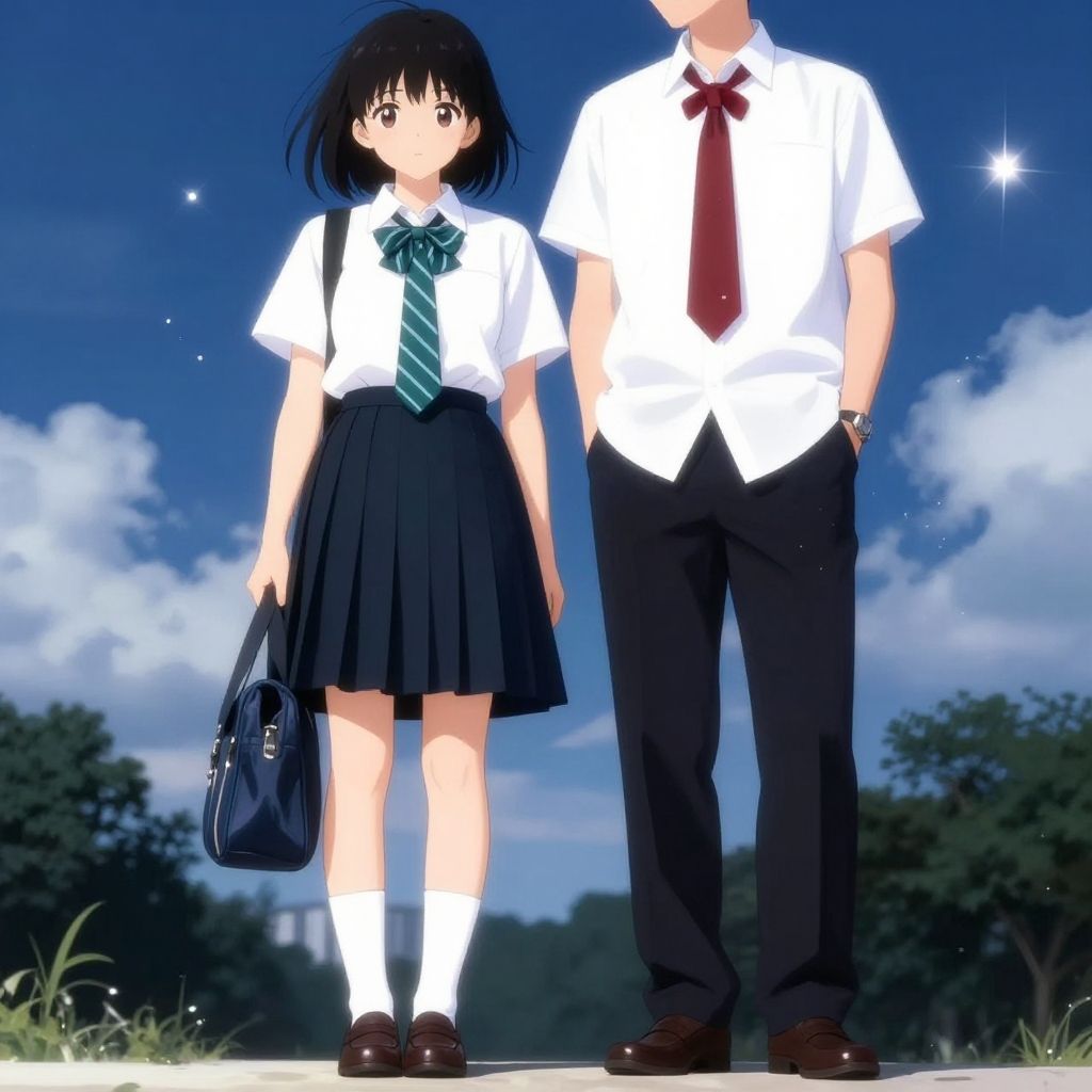 Anime-style digital drawing of tall, brown-haired boy in school uniform holding hands with shorter, black-haired girl in school uniform, standing on sunlit,