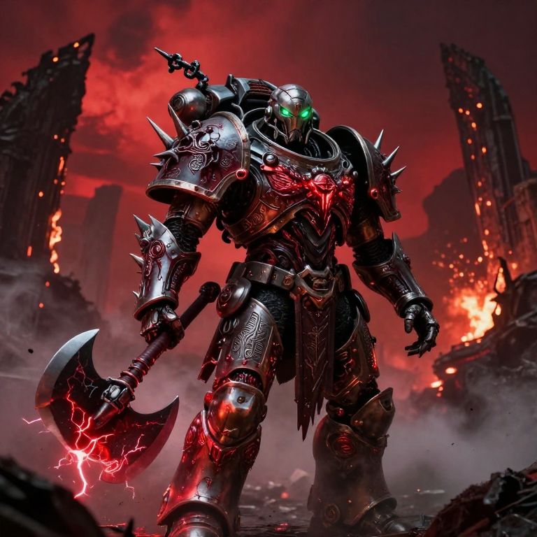 A Chaos Space Marine in full battle armor, standing amidst a war-torn battlefield, His armor is an intricate fusion of ancient, corrupted metal and twisted organic growths, glowing with chaotic energy, The armor plates are etched with unholy runes, and dark, crimson blood oozes from the cracks, pulsating with an eerie light, Wickedly sharp spikes and jagged chains adorn his shoulders and gauntlets, while a massive, barbed power axe crackles with red lightning in his hand, In the background, colossal ruins burn under a blood-red sky, as black smoke rises, illuminated by sporadic explosions, Faint echoes of demonic whispers fill the air, The scene is lit with harsh, dynamic lighting that casts deep shadows and highlights the metallic sheen and organic textures of his armor, The glowing eyes of the Chaos Space Marine pierce through the darkness, emanating an unsettling, otherworldly green glow, The atmosphere is thick with fog and drifting ash, creating an intense, apocalyptic mood, Photorealistic