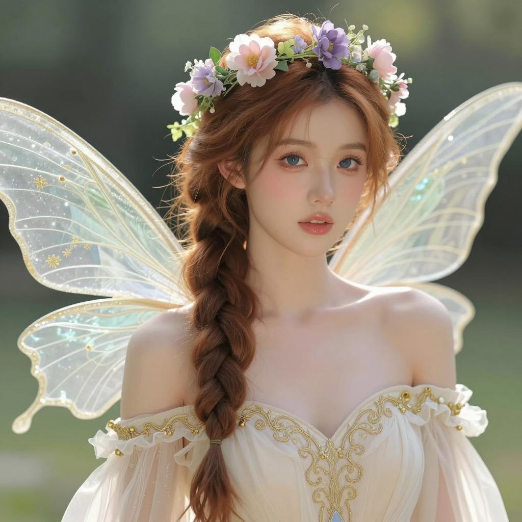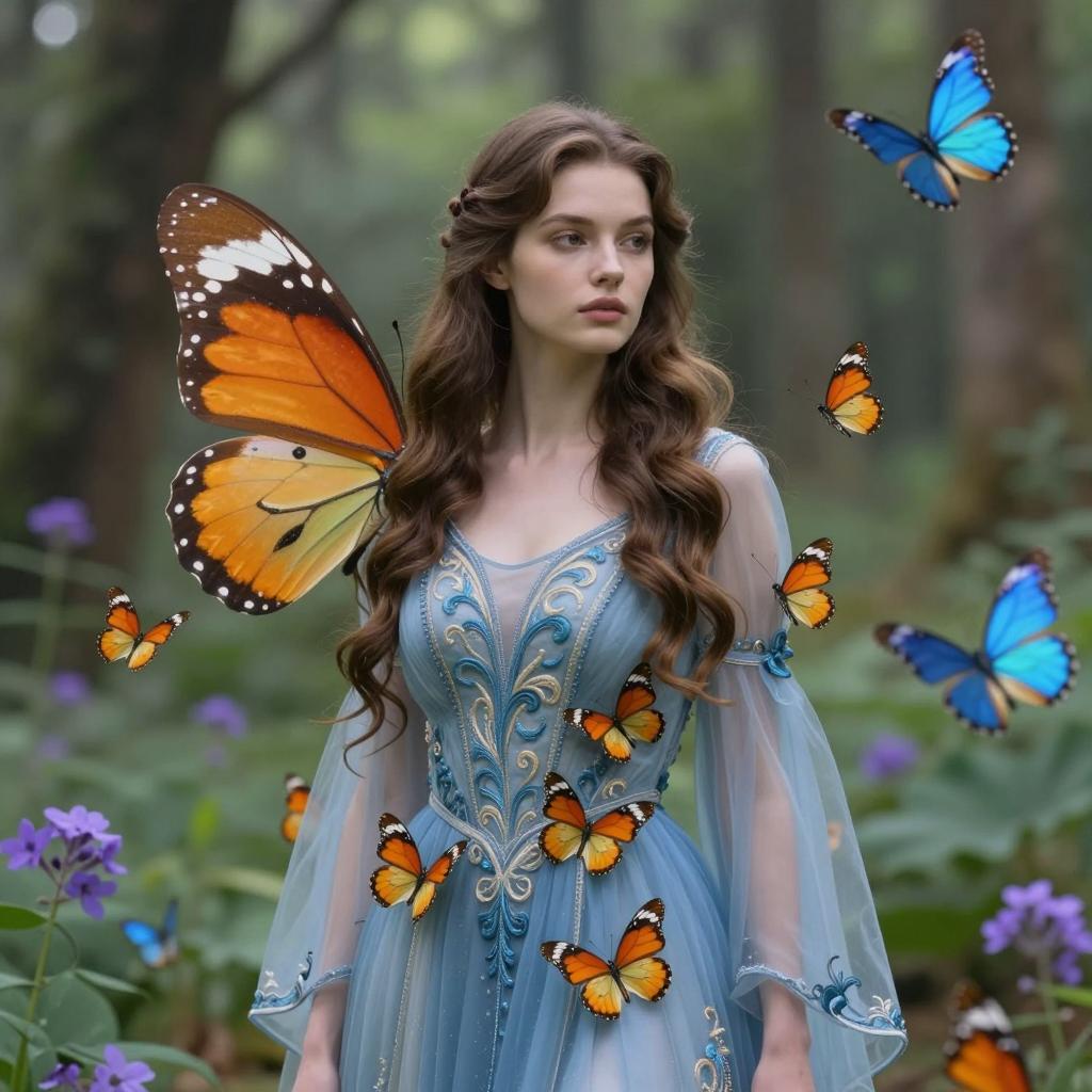 Blue butterfly costume, digital art, fantasy, female, blue butterfly wings, blue and black intricate bodysuit, long wavy brown hair, forest background, butterflies around, realistic style, ethereal, blue butterfly crown, standing, focused expression, magical, high detail, hyper-realistic, T2I, stunning, beautiful, enchanting, nature-themed, forest path, lush greenery