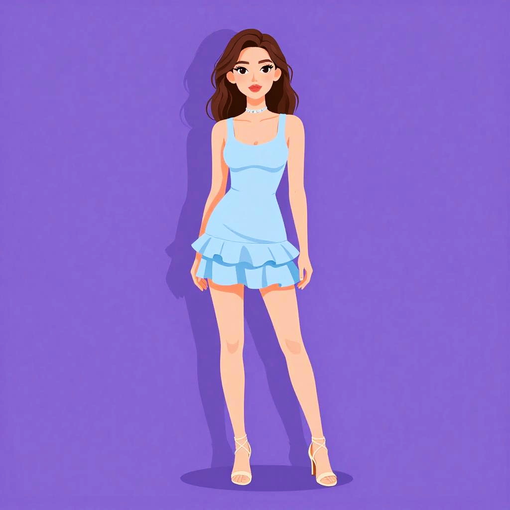 Digital illustration of a young woman with fair skin and long, wavy brown hair, standing against a solid lavender background. She wears a bright yellow, spaghetti-strap, knee-length dress adorned with green speckles near the top. Her expression is calm with a slight smile, and she has dark, arched eyebrows and pink lips. The dress has a soft, flowing texture, and her shadow is cast to the left. The style is whimsical and cartoon-like, with vibrant colors and smooth lines.