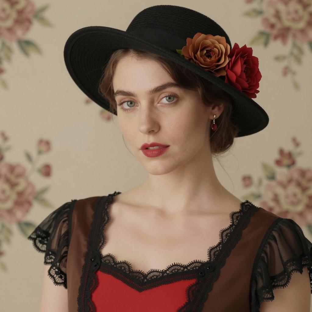 Portrait of a woman with fair skin, green eyes, and red lips. She is wearing a black wide-brimmed hat adorned with red and brown flowers, a lace-trimmed brown and red dress featuring black pleated sleeves. The background has a vintage floral pattern. She looks directly at the camera with a neutral expression, wearing a single drop earring on her left ear. Soft, natural lighting emphasizes the classic vintage aesthetic.