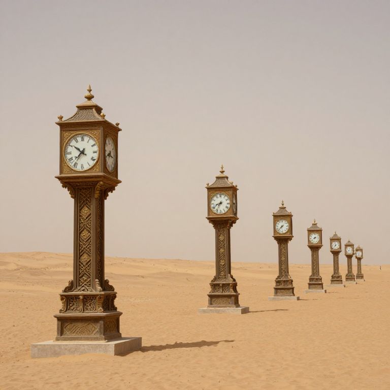 In a desolate expanse of sand, an endless procession of ornate tower clocks stands as silent sentinels, their ticking whispers echoing the relentless march of time, evoking a profound sense of transience and the enduring mystery of forgotten eras.