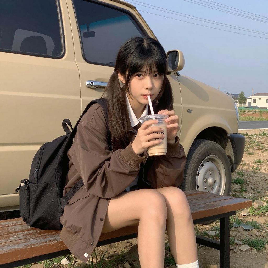 Asian girl with black hair, brown jacket, and black skirt, sipping bubble tea, sits on wooden bench beside beige van, holding black backpack.