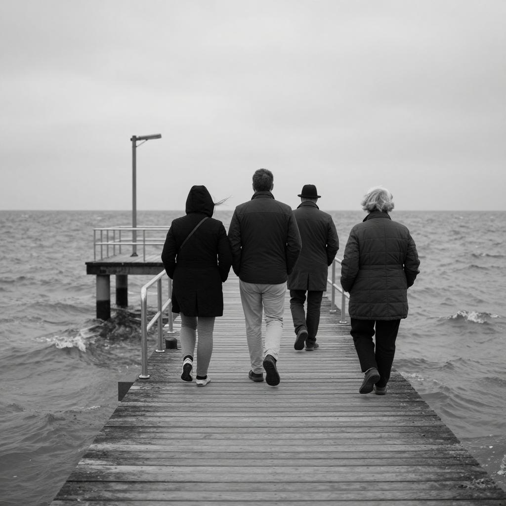 Black and white photograph. Two people standing on a wet, weathered pier, facing each other. Ocean on both sides, waves gently touching the pier. Overcast sky with thick, dark clouds. Reflections of people on the pier's surface. Pier extends from the foreground to the horizon. People's silhouettes are centered on the pier, facing each other.