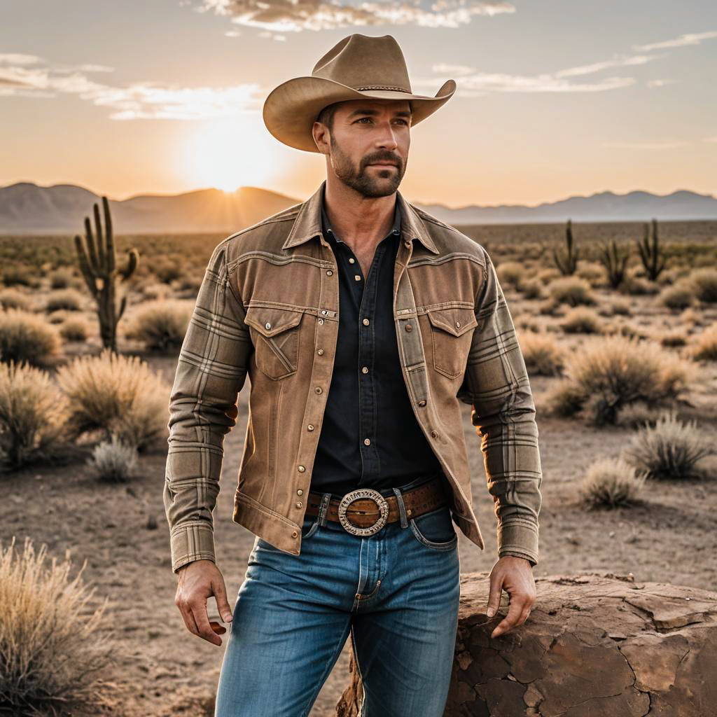 Portrait of a muscular man wearing a desert sand cowboy hat, plaid shirt, linen denim jeans, and a leather belt with buckle standing in a sunset ranch desert landscape. The man has a buzz cut hairstyle and a beard, with one hand in his pocket and the other relaxed by his side. The background features dry desert vegetation, a classic truck, distant mountains, and the sun setting behind the horizon.